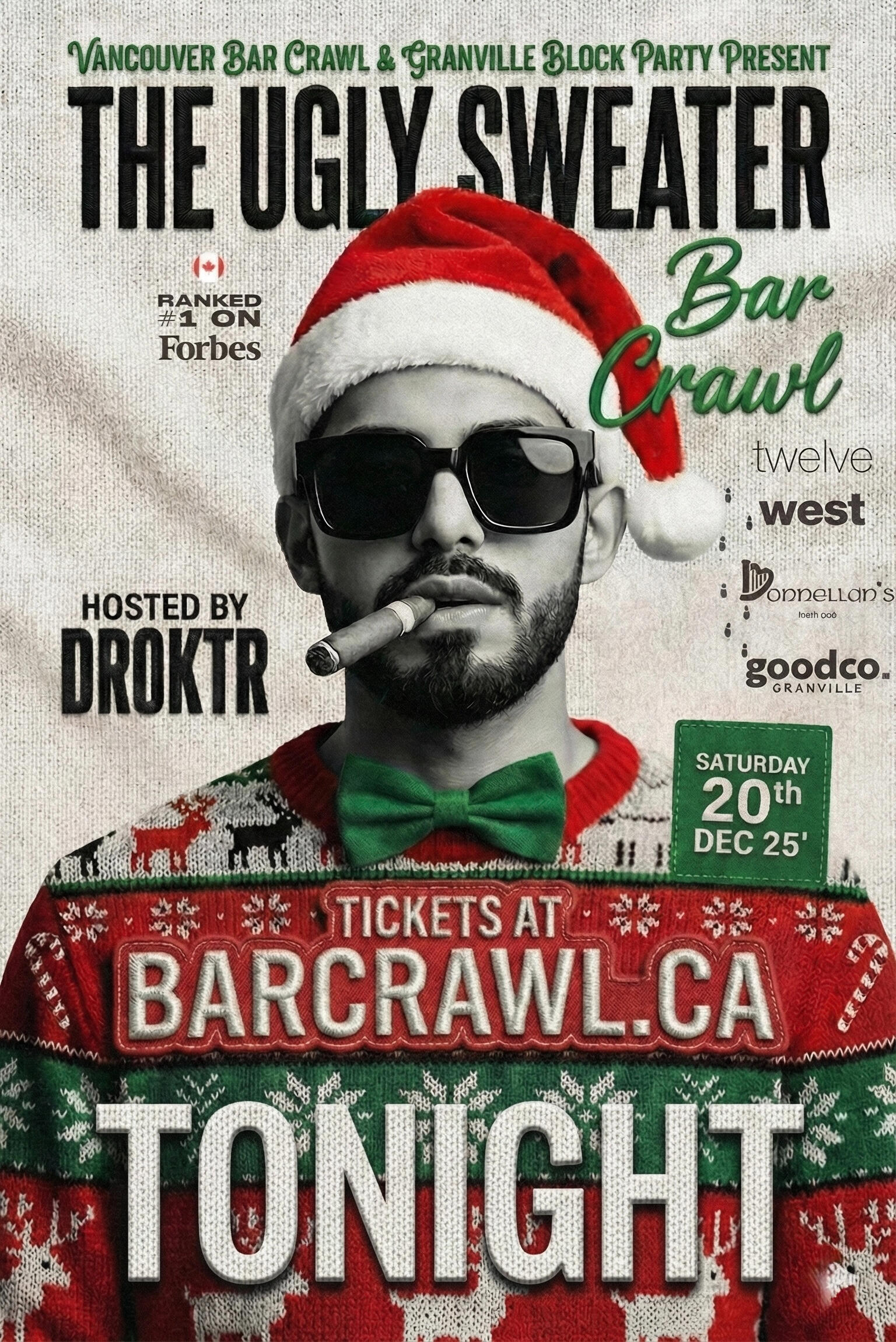 THE ANNUAL UGLY SWEATER BAR CRAWL BY VANCOUVER BAR CRAWL AT TWELVE WEST, DONNELLAN's & GOOD CO ON GRANVILLE. HOSTED BY DROKTR. 🎄Presented by Vancouver Bar Crawl x UBC x SFU Parties x Granville Block Party 🍻Vancouver’s holiday season gets loud. Throw on your ugliest (or funniest) sweater, link up with your crew, and crawl Granville with a full-room vibe at every stop.📅 Date: Saturday, 20th Dec 2025🗺️ Bar Crawl Route (Times)