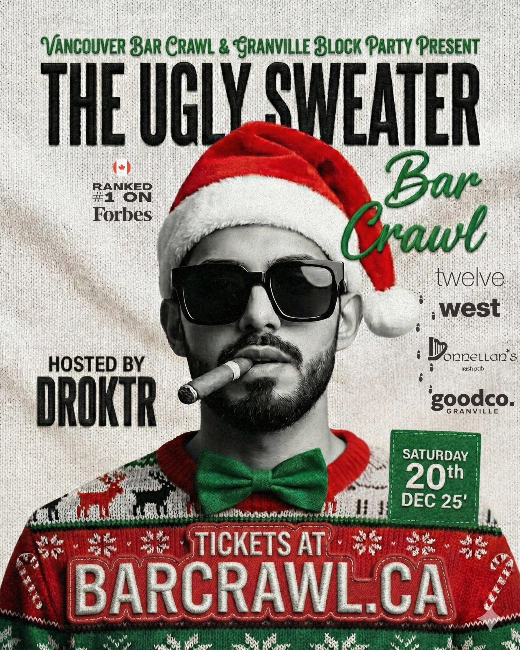 THE ANNUAL UGLY SWEATER BAR CRAWL BY VANCOUVER BAR CRAWL AT TWELVE WEST, DONNELLAN's & GOOD CO ON GRANVILLE. HOSTED BY DROKTR. 🎄Presented by Vancouver Bar Crawl x UBC x SFU Parties x Granville Block Party 🍻Vancouver’s holiday season gets loud. Throw on your ugliest (or funniest) sweater, link up with your crew, and crawl Granville with a full-room vibe at every stop.📅 Date: Saturday, 20th Dec 2025🗺️ Bar Crawl Route (Times)